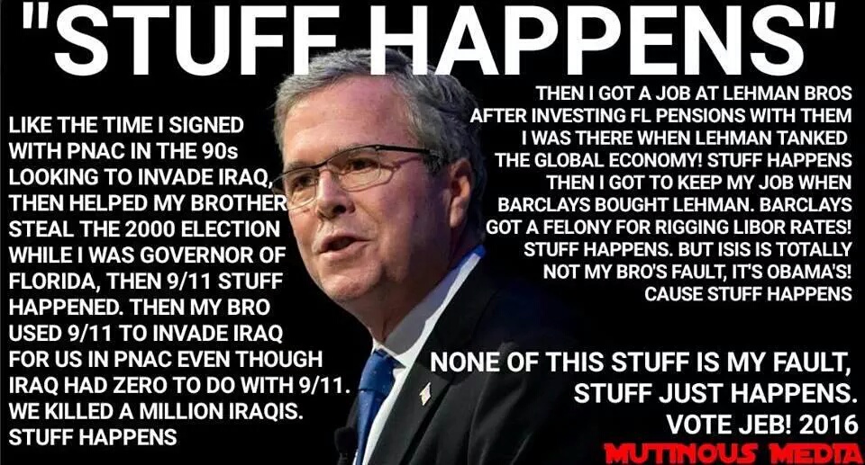 Jeb Bush when asked about tougher Gun Laws said :” Stuff . ! ” Well Jeb it does and as the MEME ABOVE SHOWS ! Alot of it involves you and YOUR FAMI LY !