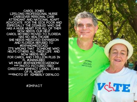Carol works with NATIONAL ADAPT – The Non profit organization who advocates for Disabilaty Rights. She has been arrested several times as an Advocate on this cause. Last Year Carol was with The ADAPT Family in Wasington D.C. Fighting to #ProtectOurCare. And She and ADAPT Won !! Saving Access to Affordable Quality #Healthcare For 52 Million Americans. Thank You ADAPT Family and Carol for keeping this Advocate’s Dream of #ExpandMedicaidNow in Fl alive without them No one would have Healthcare in America except the Wealthy or Those over age 65.