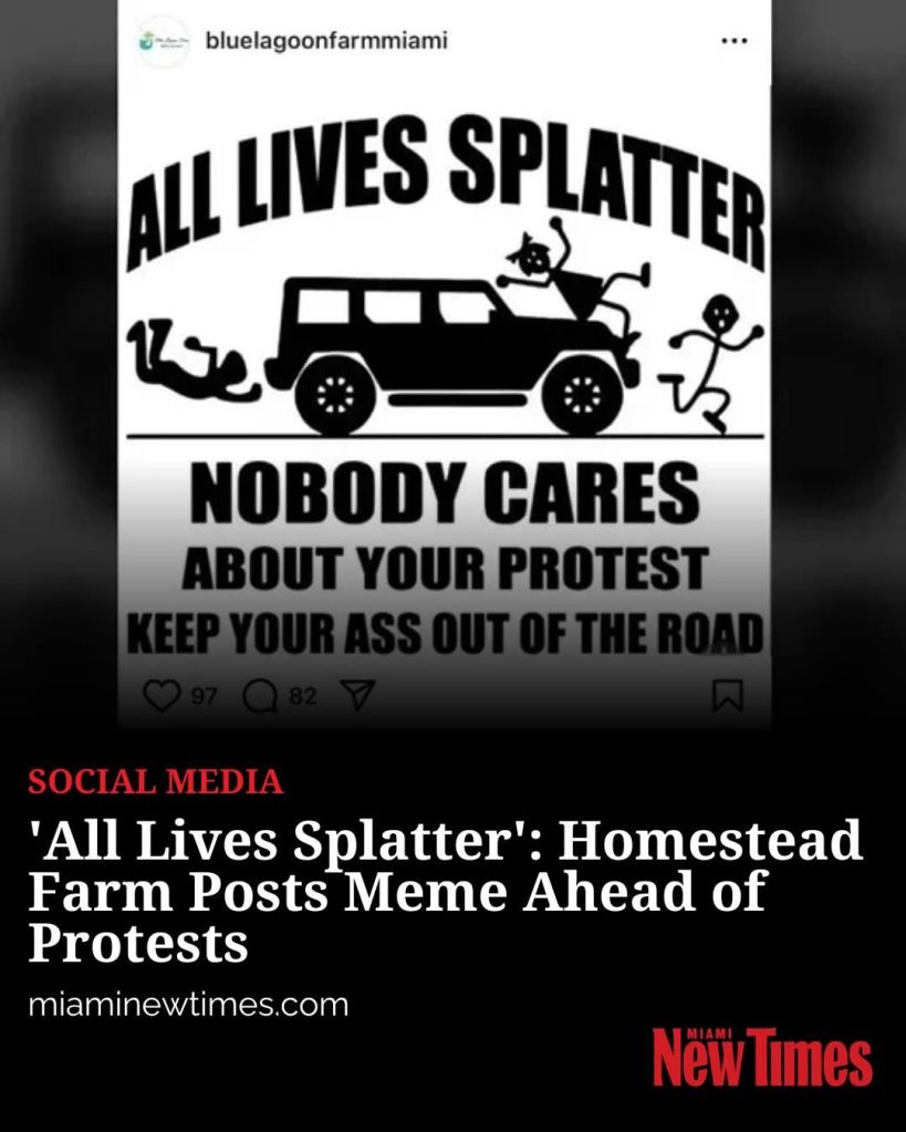 #Repost @miaminewtimes —— miaminewtimes As people prepare to take to the streets in South Florida on Saturday for the “No Kings” protests, a Homestead business threw its support behind Gov. Ron DeSantis’ approval of drivers running over protesters if they feel threatened. During a Wednesday night interview with Dave Rubin of the Rubin Report, DeSantis said drivers do not have to worry about hitting protesters in the street if they are trying to flee for their safety. Following DeSantis’ appearance, Blue Lagoon Farm Miami in Homestead posted a meme on its Instagram account with a car running over people titled “All Lives Splatter.” The post was eventually removed. People have now taken to Google to write one-star reviews referencing the “All Lives Splatter” post. ✍️ Read the story by Naomi Feinstein at miaminewtimes.com (link in bio). 📷: Reddit #miaminewtimes #miamifl #homesteadbusiness #protest #socialmediapost View all 338 comments