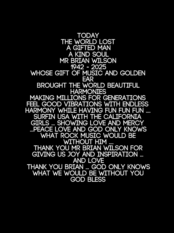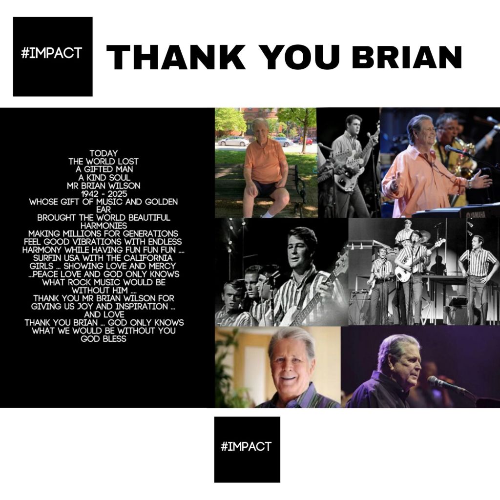 Today The World Lost A Gifted Man A Kind Soul Mr Brian Wilson 1942 – 2025 Whose Gift Of Music and Golden Ear Brought The World Beautiful Harmonies Making Millions For Generations Feel Good Vibrations With Endless Harmony While Having Fun Fun Fun …. Surfin USA With The California Girls … Showing Love and Mercy …Peace Love And God Only Knows What Rock Music Would Be Without Him …. Thank You Mr Brian Wilson For Giving Us Joy and Inspiration … And Love Thank You Brian … GOD Only Knows What We Would Be Without You God Bless #IMPACT #BrianWilson #GoodVibrations #Beachboys #TheBeachboys #California #WestCoastSound