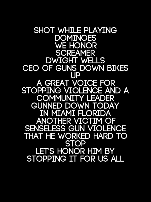 This One …. Shot While Playing Dominoes We Honor Screamer Dwight Wells CEO OF Guns Down Bikes Up A Great Voice For Stopping Violence And A Community Leader Gunned Down Today In Miami Florida Another Victim of Senseless Gun Violence That He Worked Hard To Stop Let’s Honor Him By Stopping It For Us All #RIPDwightWells #DwightWells #Screamer #endgunviolencenow #endgunviolencetogether #EndGunViolence #gunviolenceawareness #gunviolenceprevention #bikesupgunsdown #IMPACT